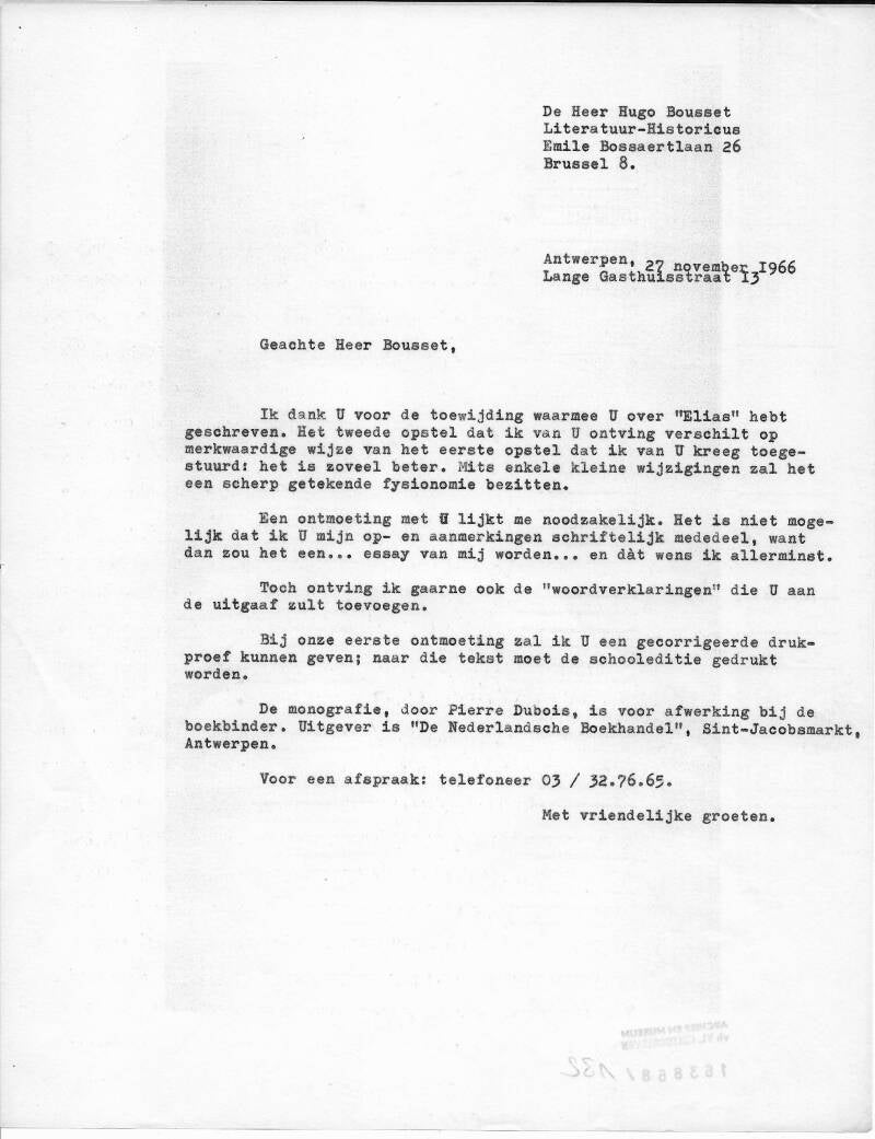 Het belang van Maurice Gilliams voor mijzelf ? Ik kreeg midden jaren 1960 – pas afgestudeerd aan de KU Leuven – een eerste literaire opdracht: een schooluitgave verzorgen van Elias of het gevecht met de nachtegalen van Gilliams voor de reeks ‘Caleidoscoop der Nederlandse Letteren’ (De Clauwaert), onder de redactionele leiding van J. Smeyers en B.F. Van Vlierden. Ik stuurde mijn inleidingen naar de auteur zelf, die stipt rea geerde. Mijn eerste contact met een ‘groot schrijver’ … Ik bezorgde hem achtereenvolgens een academisch stuk (‘Situering in Nederlands en Europees verband’) en een essayistische tekst (‘Vita brevis’). Zijn reactie in een brief van 27 november 1966 kan u hierbij lezen. Het was voor mij een echte eyeopener. De tweede tekst vond hij ‘zoveel beter’ dan de eerste … Ik werd dankzij Gilliams in een vroege fase verlost van de neiging van aca demici om alles te verklaren en te bewijzen. Het werd me duidelijk dat een essay de bedoeling heeft een creatief antwoord te geven op de besproken tekst. Later ontmoette ik termen en zinnen als ‘dissémination’ (J. Derrida) en ‘étoiler le texte au lieu de le ramasser’ (R. Barthes): een literair essay tracht niet dé betekenis te achterhalen van een tekst, maar de betekenis sen van de tekst verder uit te zaaien, betekenissen toe te voegen, de lege plekken in de tekst op te vullen met eigen interpretaties, die op hun beurt weer openstaan naar de lezer van het essay.